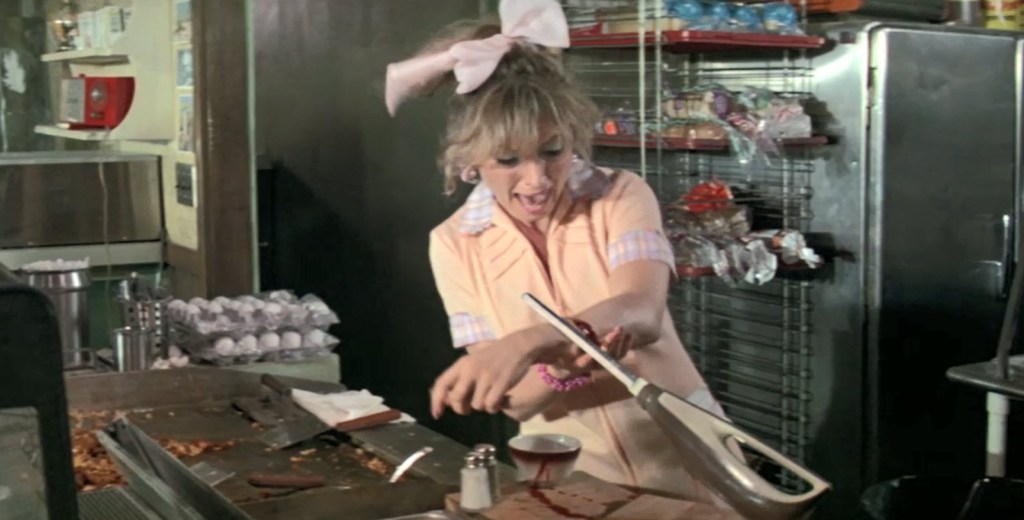 I don’t know so much about Wanda June, the waitress that got sliced by the electric knife earlier. I do know s+he is drunk on a 40 of Miller High Life. She starts going on and on about how we made them. She even goes outside and has one of the all-time greats in overacting moments as she screams “WE MADE YOU!!!!” along with some other things that I couldn’t quite make out. It’s kind of great but in one of those “this is really dumb and shitty” sort of great ways.