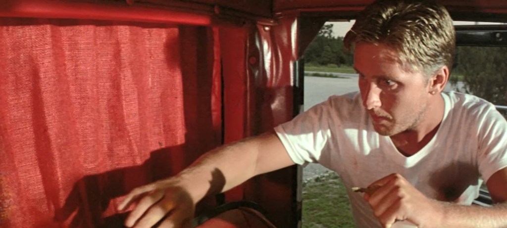 Our hero arrives at a truck stop, and, no, I’m not referring to Emilio Estevez. It’s the Happy Toyz truck with Norman Osborn right there on the front. Now, this is where most of our movie will remain. Emilio Estevez, playing Bill, is a short-order cook at the truck stop. Pat Hingle plays the guy who runs the truck stop. He’s a massive dick. He wants Bill to work for a full nine-hour shift, but only clock in for eight. He holds Bill’s parole over his head. In fact, most of the employees at the stop are parolees, and are being taken advantage of by Pat Hingle.