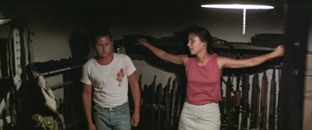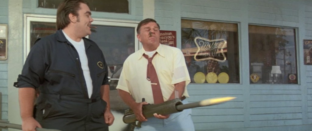 Bill grills one of Bubba’s employees, Joey, about where he got the rocket launcher. Apparently, Bubba has a whole damn arsenal in the basement of the truck stop. Now, before you ask why there would be such a thing you have to remember some key things. First, this was an 80s movie. Even romcoms had basement arsenals in the 80s. Second, this is America. Duh… We all have basement arsenals even today. Third, this is North Carolina. That’s what we call a “red state”. That means there’s probably a second, larger arsenal under that arsenal.