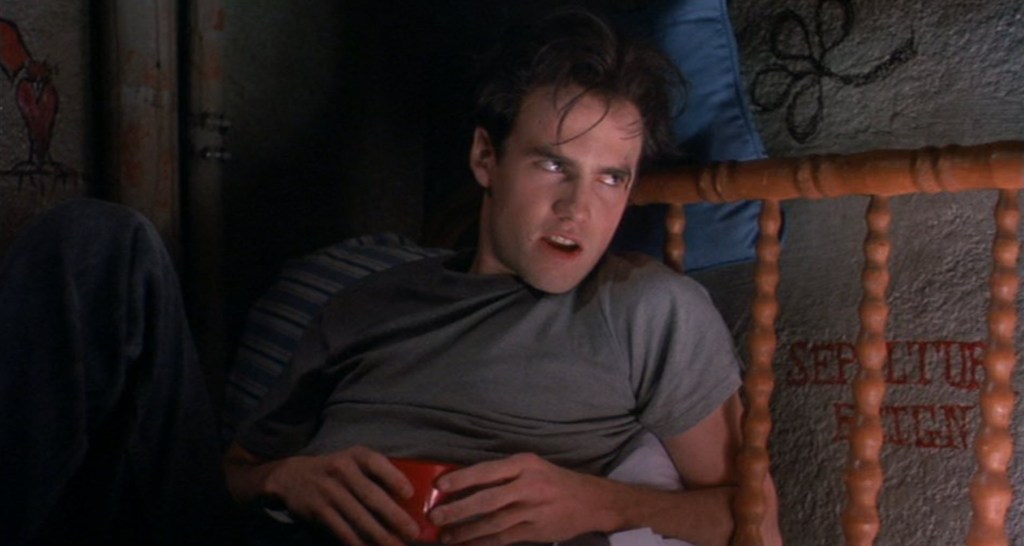 Things start to slide a bit here. So, it’s said that Breckin Meyer’s Spencer is a stoner. We see him lighting up a doobie in the van earlier when Tracy is trying to get them out of town. He apparently immediately did the drugs when they got inside the Krueger place. This is relatively classic silly drug stuff where he’s tripping but it’s never really said that he’s dropping acid, only smoking pot. Anyway, he’s woken up by the old school off-the-air signal (on a broken TV) and we see Johnny Depp’s big cameo. You see, Depp was a big deal at the time of this movie’s release. However, he was not-so-big of a deal when he played Nancy’s boyfriend in the original A Nightmare on Elm Street. His cameo in this was his loving thanks to the series that helped launch him into being a modern-day weirdo.