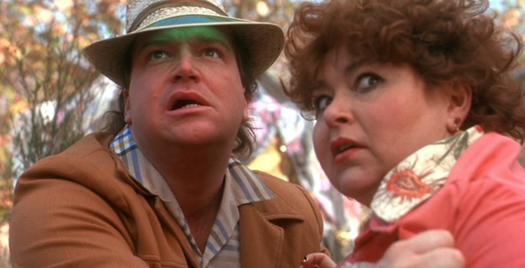 Yes, yes… Tom Arnold and Roseanne Barr had cameos in this film. That’s not what I’m talking about when I say it’s a creepy sight. (Though, I’ve seen what Roseanne talks about after a fistful of Ambien, so…) No, the fair is just adults kind of listlessly wandering about and muttering things. The place is completely devoid of kids and the adults are all insane. Roseanne wants to take the cannon fodder gang in as new kids and even says she’ll do a better job of hiding them this time. Tom Arnold tells her that kids are a definite no-go as it brings “him” to the town too.