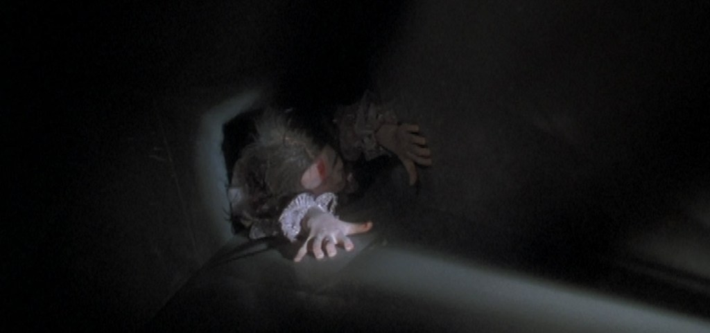 Michael uses the knife to pry the door off at the bottom of the chute. He then tries grabbing for Jamie and stabbing for her, but he can’t reach her based on how high she is able to pull herself up. He then decides to stab at the flimsy metal that makes up the chute. She climbs all the way back up and out of the chute and finds her way to the attic where she finds a coffin, Tina’s dead boyfriend, and, unfortunately, her dead dog and Rachel.
