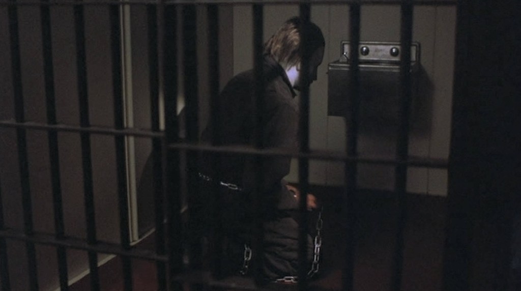 The moment passes when Jamie tries to wipe the tear from his face and he’s spooked by the casket falling over. Jamie runs away again only to run into Dr. Loomis who, again, uses her as bait. He yells to Michael that if he wants her he can come and get her. But, in reality, he’s leading Michael into a trap where he’s caught in a heavy net. Loomis then hits him with several tranquilizer darts. Michael still doesn’t go down until Loomis beats him with a 2×4. Loomis, exhausted collapses on top of his longtime patient. Meeker and the deputies return and arrest him.