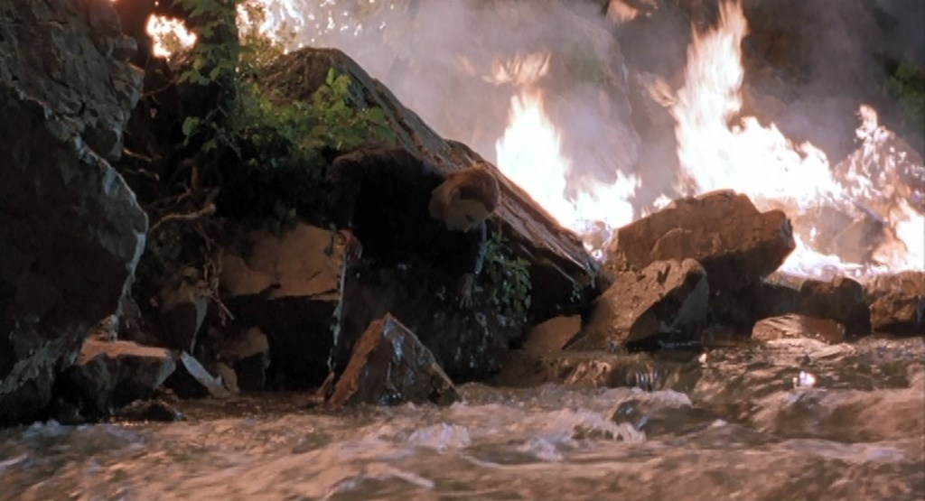 Now, falling into a mineshaft that we didn’t really know was a mineshaft and his ability to escape via rushing rapids might seem completely and totally out of leftfield and insane for this movie, but that doesn’t compare at all to what happens next.