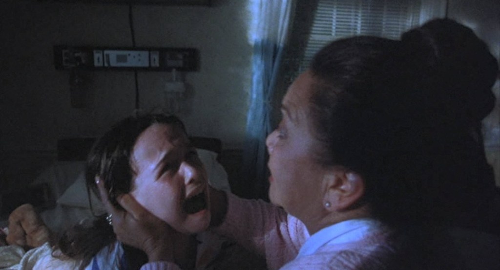 Loomis tells Michael that Jamie can help him relieve the rage. I’m not sure what the idea here is. Michael initially does not attack until he nearly gets the knife away from Michael. Then, Michael slashes Loomis in the torso and throws him around a little bit. Loomis is a tough bird. This isn’t the end of him.
