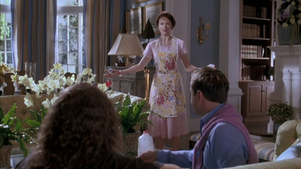This leads to maybe the most interesting thing about this version of the movie. Joanna tries to be better for Walter. Walter doesn’t want her to wear black anymore, so she puts on a pink dress and colorful apron. She tries cleaning up around the house. She tries to walk back her own thoughts on the whole Sarah Sunderson thing and take Mike’s word that she’s fine. She even tries to convince Roger and Bobbie to go visit Sarah. You know, because that’s what people outside of Manhattan do to show they care about someone.