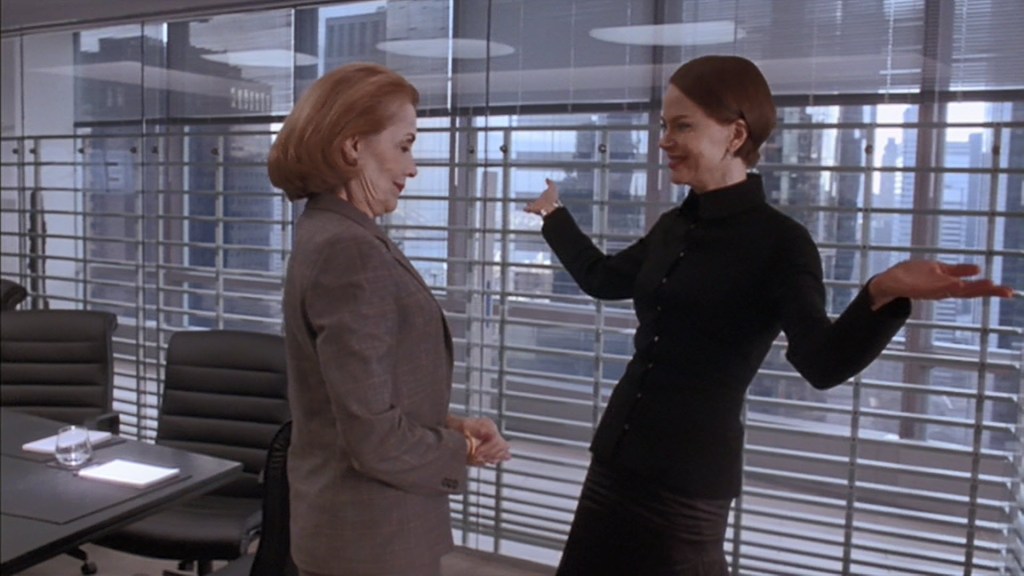 In this version, she’s a capitalist scumbag who profits off of misery. Granted, she’s kind of a parody of this particular wave of feminism at the time that was very much a “girl boss/girl power” kind of movement. It’s over the top with how tribalistic the sentiment is. It’s very obviously a turning-the-tables sort of thing. Sure. Sure. I get what it’s trying to do. However, if we think about where this is going to end or what path her life will take once she’s in Stepford, does it make sense for her to be so harshly characterized at the onset?