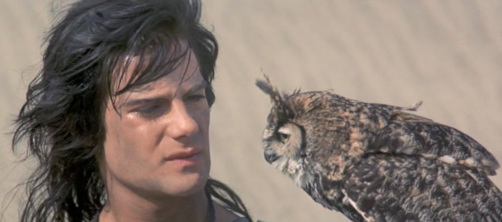 We get back to that one dude with the fuckin’ falcon the night before. He’s Darstar, played by Adrian Pasdar. He draws a symbol in the dirt. Everyone around him thinks this looks like something pretty cool. He calls to him two crows. I think that’s probably what he had the night before too. The Scorpions come over to kick at his crows and mess up his symbol in the dirt. Their leader, Gavial, has a thing for Terra. I’m guessing he thinks he can win her over to the bad side because she’s actually maybe the toughest talker of the Solarbabies, but she just threatens to swing a shovel at his crotch.