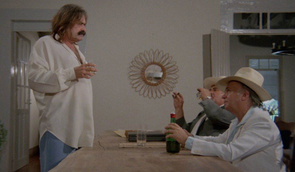 Instantly, our movie opens with South American music and a guy waiting to meet someone coming in on a private plane. Now, I don’t want to be that type of guy, but there is something about this beginning that kind of already gets my brain noodles cooking. There are four guys in total we see here at the onset of this movie. There’s the guy who drives a jeep to the small airstrip to meet three other guys coming in on the private plane. With the pilot, we have two passengers wearing hats. One guy is wearing a white suit. Like, think Panama Jack. The other guy is smoking a fat cigar. Think Texas oil guy. When they get into the jeep to take off, the guy who came with the jeep does not drive. It’s the pilot. I don’t know what it is about this that suddenly made my brain melt, but when you have someone driving a vehicle to meet other people and then that driver takes the passenger seat for the another guy? That’s up there with those little strange things a lot of movies do. Like, someone is offered a cup of coffee and they take somewhere between zero and one sip of the coffee and then say they have to go. Or someone pulls out a cigarette, lights it, takes two drags, and then snuffs it. Do they know how fucking much packs of smokes are these days?