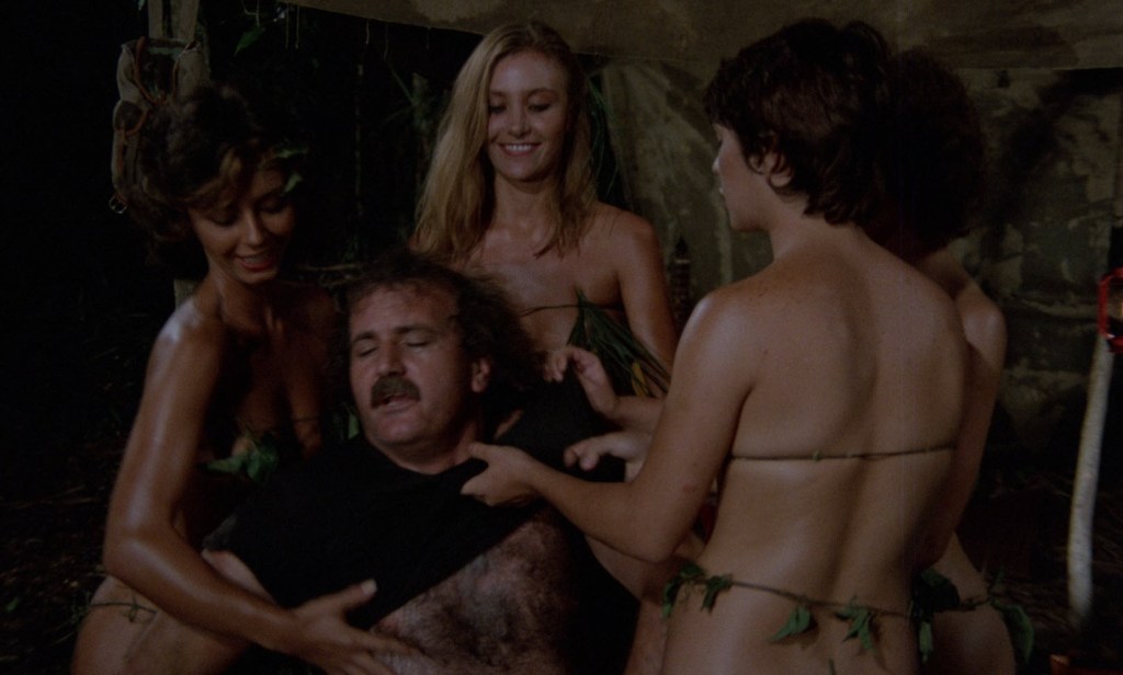 The girls put on vines and leaves and begin to molest the guys and ask them for food.