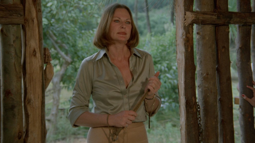 Is this a good movie? In terms of the women in prison genre, it’s not too bad at all. There’s less of a prison in the sense of a government-run correctional facility and just kidnappings, but all the rest of the beats are there. Lingering shots of gorgeous bodies and bare breasts, cruel situations that happen to characters who maybe didn’t have it coming. A lot of action in bursts and a bloody finish. All the trappings are there. The final third of the movie is not great when placed next to the first two-thirds. However, if I walked in on someone watching the movie and hadn’t seen this before, and it was right at the start of the third act, I’d be invested. All the pieces and vignettes that seem to make up each individual scene or act are good. It just sometimes feels like the movie also went through the blender and it led to this really fascinating movie that just kind of kept going and just told us what each scene was going to be and how the characters were going to react to the scene and it might be different than the scene before and it might be different than the next scene, but that’s just what it is.