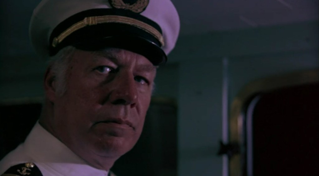 So, yeah, the captain of the cruise ship is the curmudgeonly Captain Ashland, played by George Kennedy. He runs a tight, fuckin’ ship. He tells the helmsman that they’re two degrees off course. He tells the new captain who will be taking the ship over in a few days, Captain Trevor Marshall, played by Richard Crenna, that this crew is always needing to be watched or they’ll fuck around and, I dunno, blow up the fuckin’ boat or something. Additionally, he is not one for these damn passengers and their dinners and their parties and their shenanigans. He cares only about the ship.