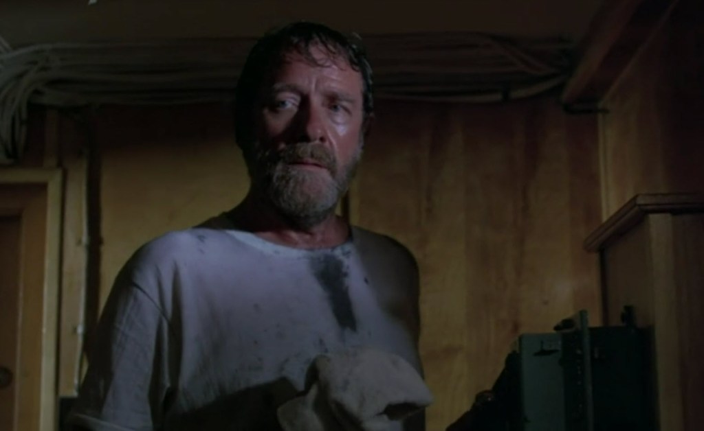 Neither Lori nor Marshall can reach him before the ship swings him over to the water and lowers him into the water. It seems like it’s going to hold him underwater but it pulls him back up. The ship raises its anchor and takes off. It’s at this point that the ship dumps Saul Rubinek into the ocean where he is ripped under in the undertow created by the ship’s movement.