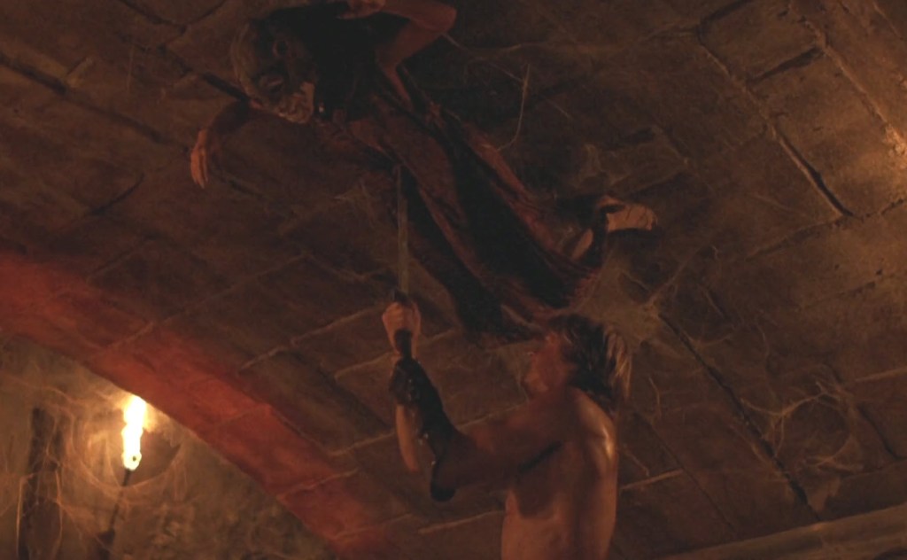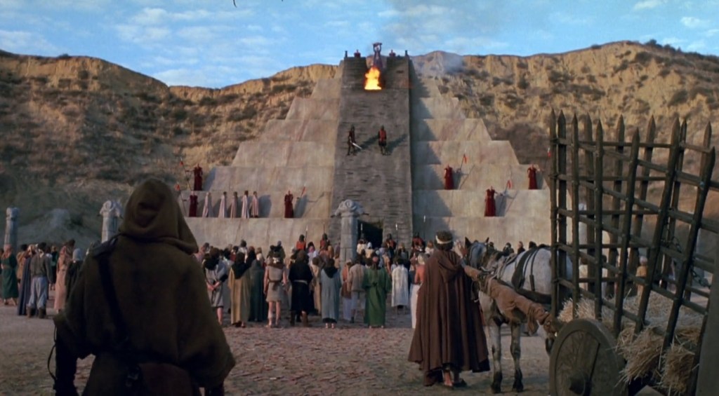 The movie opens with a trio of robed men going to a temple to meet with a trio of scantily clad witchy oracles with some serious butterfaces. These chicks are looking into a pool of water to see a woman. This woman is carrying the son of King Zed. These witches tell the High Priest Maax that this son of Zed’s will be the one who will kill Maax in the future. Soon, King Zed barges in and tells Maax that he’s no fan of his heathen religion or his desire to sacrifice a child, so he’s to be banished. After Maax shows how loyal his people are to him by having his two compatriots kill themselves in front of the king, Zed tells his guards to arrest Maax.