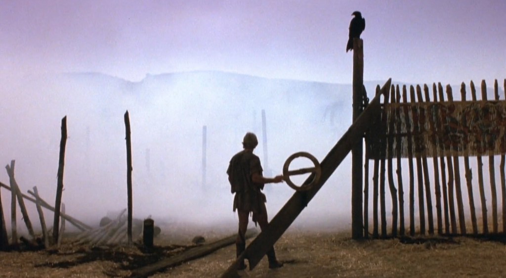 Negotiations instantly break down. And by that, I mean the barbarians don’t even bother to stop and talk to Dar’s father and his buddy at the gates. They just bowl right through them and start killing everyone and lighting the place on fire. It’s chaos before Dar and the rest of the younger, more able-bodied men return to the village. Dar fights pretty well and even kills some of the barbarians, but he’s eventually knocked out.