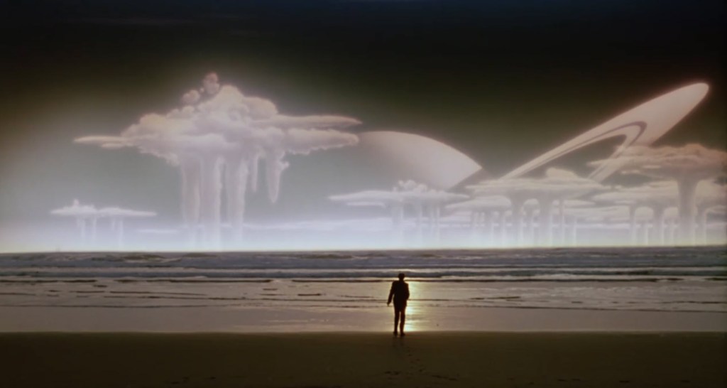 We then find Zac on the beach. Strange clouds fill the sky. He still has his recorder. He gazes out to the horizon and watches as a large ringed planet rises in the sky while the credits roll over the haunting scene and most popular image from the film.