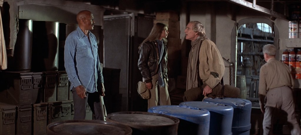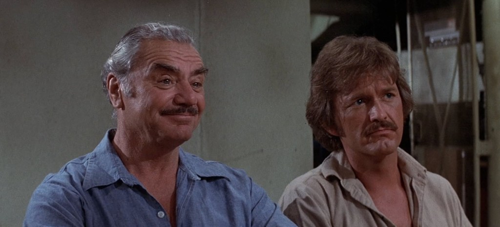 But, then again, let’s talk about more Oscar-caliber actors in this cast. Playing Rann, a man who has a boat anchored off the coast and away from the mutant ravagers, we have Ernest Borgnine. Borgnine is known for everything in my lifetime from Escape from New York to Airwolf to The Black Hole to Spongebob Squarepants, but it was his performance as the titular butcher in the romantic drama Marty that won him the top prize in American acting. When it came to Borgnine, even when he’s playing the literal devil in The Devil’s Rain, I still always see him as a kind grandpa-type figure. I think it’s his warm, gap-toothed grin.