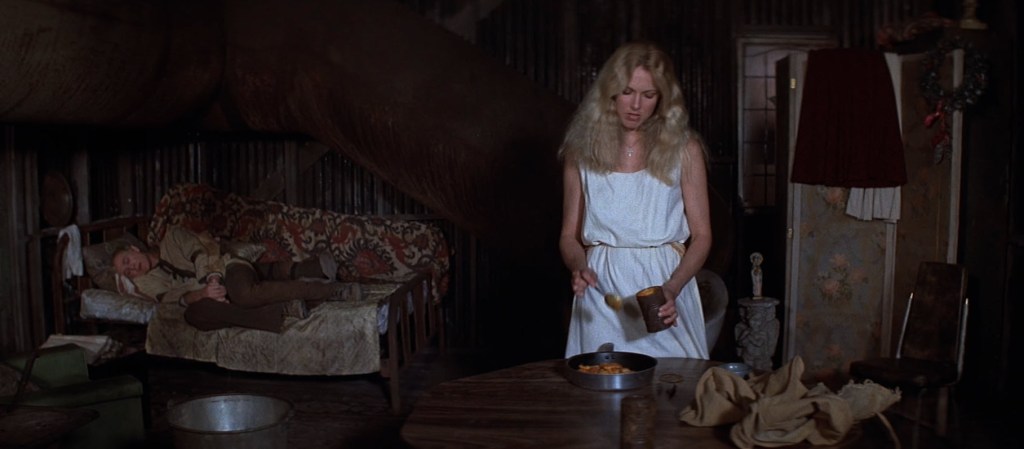 I will at least give Ravagers some grace here. It is just the two of them in a pretty desolate world where the only other people they may run into are members of a roving gang of rabid ne’er do wells. There would need to be some consideration around hunting and gathering roles and safety when being left alone. For all we know, Falk has talents for taking care of himself while Miriam might have always been a housewife or something like that. We can’t rule out that possibility based on the era in which this film was released. Maybe she was always more of an urbanite and this is not a great situation for her to be a part of now that every day brings with it struggle and strife.