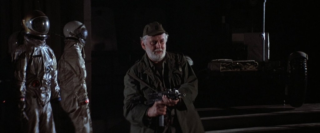 Anyway, Falk is forced to move on where he finds a curious sight… A space shuttle. Yeah. There’s just a space shuttle parked out in the wilderness. He’s in what appears to be a field where various space rockets, moon rovers, and other various space exploration vehicles are being stored. When he goes inside the building this stuff is parked outside, it’s a NASA museum. The mannequins of astronauts in various space suits startle Falk, but maybe not as startling as the live man with a machine gun also inside the building.