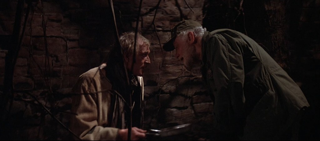 When the sergeant comes to after being knocked out in the struggle, he recognizes Falk as a superior. Falk says that the sergeant can’t have gotten the belly he has just eating grass. He takes Falk to the food ration storage bunker and gives him something to eat. Falk tells the sergeant that he isn’t part of the military and that he’s simply a loner, but this old man just doesn’t listen to him. That said, before he leaves, he wants the old man to teach him how to shoot the machine gun the sergeant gave him thinking he is a higher-ranking member of the military. The sergeant obliges and even wants to go with Falk saying he knows where there are people. Falk isn’t so sure about having this crazy old guy with him, but relents and lets the old man join him.