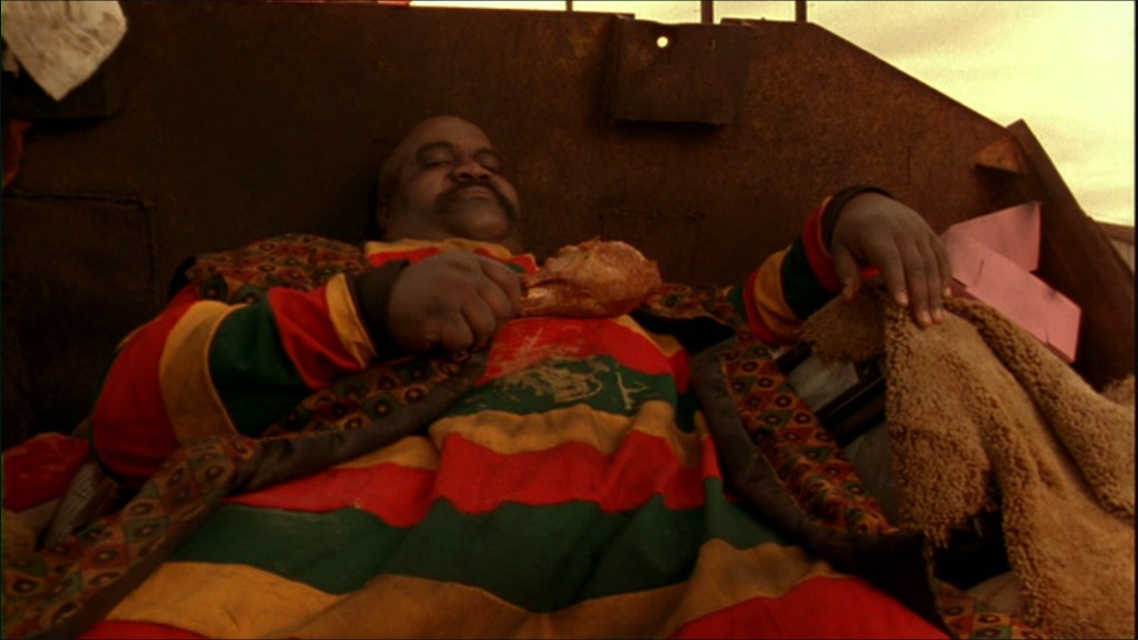 Look at that fuckin’ king, my dudes. He’s got some goons of his own. He lives in a junkyard. He gets carted around by a guy driving a bulldozer. He’s got one of those giant turkey legs I only ever see on the morning of the Indianapolis 500 when I used to go and they had all the food vendors outside the gates. This guy’s got it fuckin’ made.