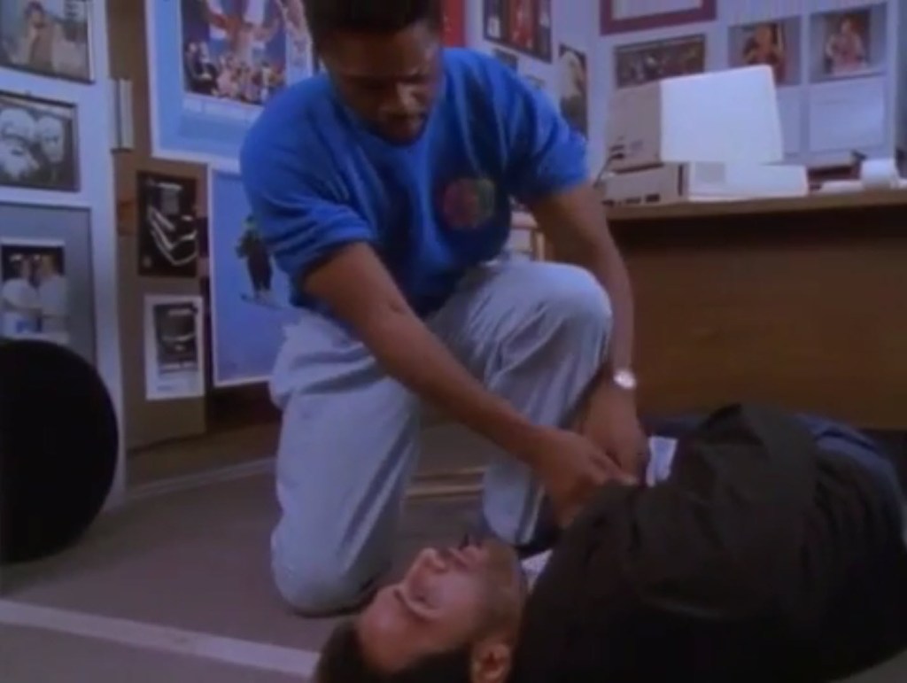 After our eeeeeevil politician is introduced, we now meet Jesse Palmer. Jesse works at a fitness gym. He’s called up to the front desk because he has a visitor – Walt. Walt was the guy who was chased at the beginning of the movie by who we now know were Whelan’s goons. We find out that Walt got into trouble before. He was previously accused of breaking into a jewelry store. Walt says that’s the least of his worries now. He’s kind of in some shit.