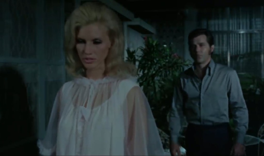 The following night, Philip and Julia are about to get into the business of making love when he suddenly kicks Julia out of the room and tells her to go away for her own good. He changes into the monster again and considers going to the door to eat Julia’s face and guts, but he stops himself and escapes through a window to eat some other poor bastard’s face and guts. That poor bastard happens to be a woman who approached him not realizing he’s a monster man.