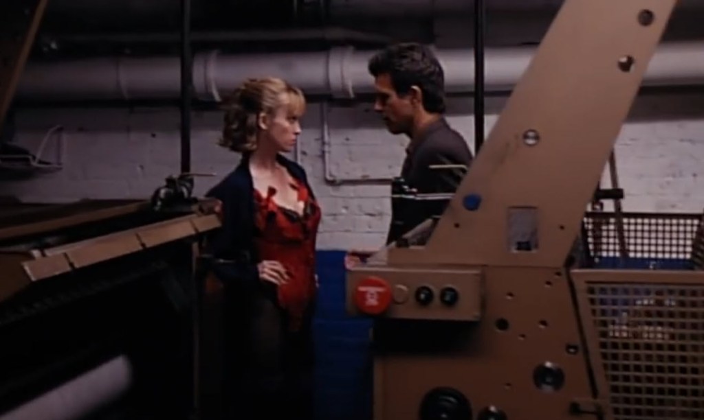 I said she nibbled his lip, right? Well, she starts pushing him away from her, then pulling him in by his tie. Then she slaps him. The next time she goes in for a slap, he blocks it. He pulls her in for some more kissing and then they fuck against the printing machine. When they arrive at the restaurant, she makes a passing move on the valet, but then she gets weak on her feet and asks, “When did we get here?”