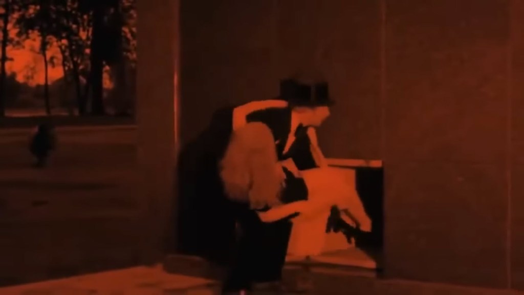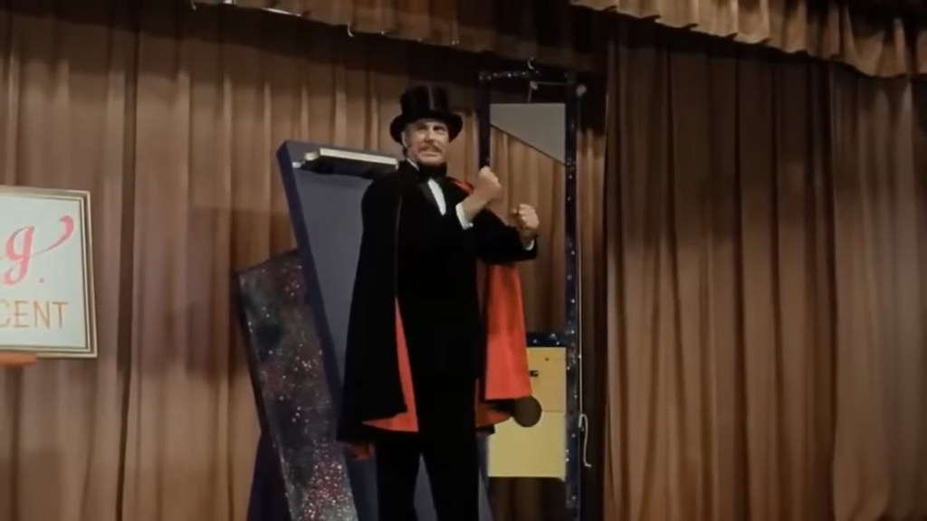 In a break from tradition for this movie, we come into Montag’s next performance with not only two volunteers, but we didn’t see them get selected nor do we really know what it is that they are tied up to do. After checking the girls’ binds, he reveals the girls will be swallowing swords. He says the only danger that will be faced in swallowing swords is the swallower mustn’t wiggle about or it will disturb their digestive tract. Sure enough, Montag crams the swords down the women’s throats. We see them get pretty good and bloody while the audience sees a normal ol’ sword-swallowing act. Even the detectives working the murder cases don’t see anything out of the ordinary.