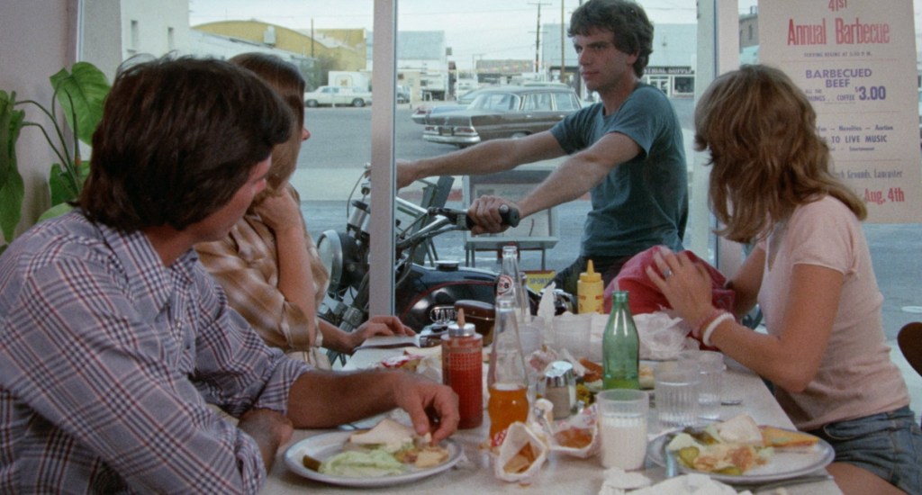 The next day after lunch, Pat pulls Jesse out of the diner to make a plea to change Jesse’s life. He points out the motorcycle dealer across the street. He wants the two of them to buy bikes, hit the road, and never come back. Jesse says that he’s got a job waiting for him in Stockton that pays better than any job he’s ever had. Plus, he’s getting married. Pat says there will be plenty of girls and Kathy isn’t the one. In fact, Pat says she ain’t all that special. Disappointed in his friend, he goes back to the girls in the diner.