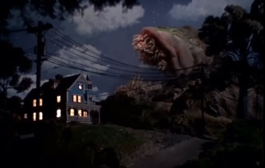 In time, it seems the locals have wiped out all the monsters. Things seem to be getting back to normal. A deputy who is stationed by Pete and Charles’ house gets on the radio to talk about the various sizes of these things the cops have seen the locals pull out of bushes and out of the ground. That’s when the ground begins to shake and out from a hill next to the house, a completely full-grown monster emerges revealing these things get real freakin’ big.