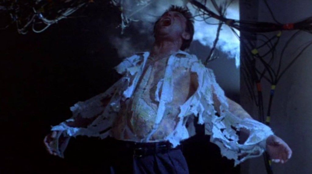One important thing does happen at the end of his jumbled mess of editing… Marshall’s body unzips like it’s a skin suit. The computer alerts the base that there is a biohazard contagion discovered. A little monster fella busts out of Marshall’s torso and escapes into the ventilation system. It just kind of bursts out of her body in a portion near her chest. I’m willing to bet that’s something you’ve never seen before in a movie.