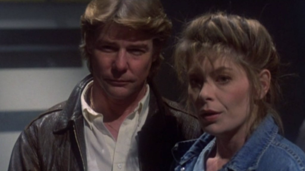 With only about 20 minutes of plot left in the movie, Xtro II suddenly remembered it forgot to include any sexual tension. Sure, maybe the dreamlike spectre of Marshall was creeping into Summerfield’s sleep, but this is a little more explicit. After the remaining survivors make it out of the corridors to the main control room, I guess someone decided that Jan-Michael Vincent needs to have a makeout scene with Tara Buckman. She’s in her quarters cleaning up after all the scary chase stuff and he just comes up and kisses her on the neck and tells her she’s looking good and that he missed her.