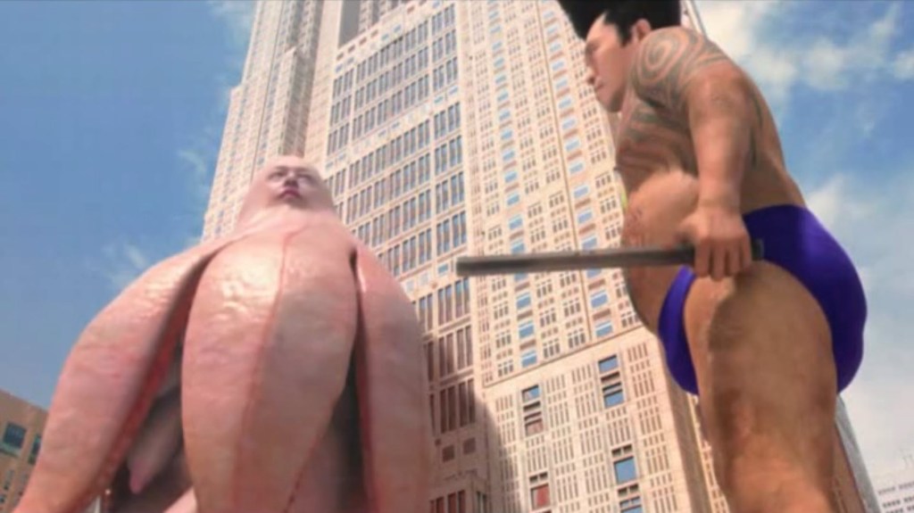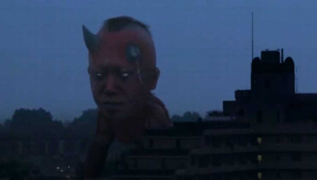 Big Man Japan approaches a Stink Monster to basically tell it to leave the city and go out to the suburbs to stop stinking up the city. The Stink Monster is not so compliant. It kicks some cars over from the traffic jam it created. It pokes windows out of the building it’s resting up against. Even shouting at it won’t get it to leave.