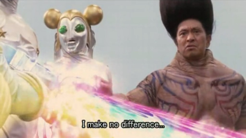 But, yes, Super Justice and fam just start picking stuff up from the street and start whaling on the Red One. It’s actually brutal. One of the moves is to place-kick the baby off the mother’s head and then jump-kick it into Red One. From there, they tear Red One’s clothes off and drag it through the street while kicking him in the head. It’s such a horrific beating they humiliate the monster until eventually, they bring Big Man Japan in to finger-laser the Red One to oblivion.