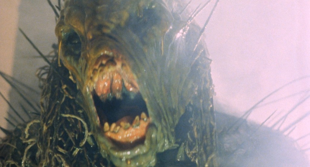 At the plant, workers start to randomly collapse as if they are gasping for air or choking on something. Their reaction to radiation poisoning leads to the plant to basically take over Tromaville High to investigate radiation levels at the school. One of the workers goes into the fallout shelter. There, he runs afoul of Chrissy’s fetus which has mutated further after being exposed to toxic waste.
