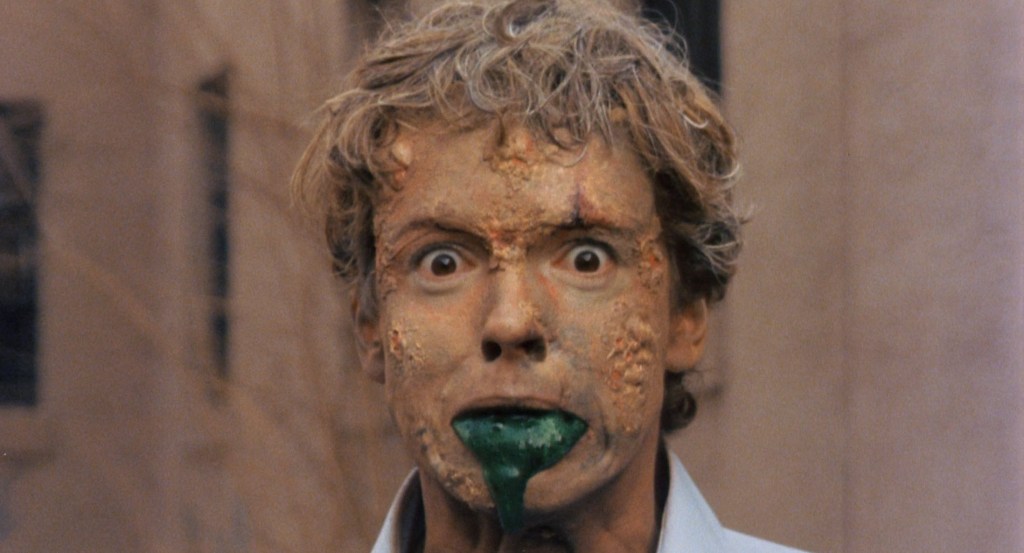 Before Dewey can kill his classmate, he begins melting from the inside out. He does the thing that almost every Troma movie does and jumps out of the window where he completely and totally melts on the sidewalk. I love that they used the same shot of the guy jumping out of the window as was used in The Toxic Avenger. I also love how many self-defenestrations I’ve seen in Troma movies.