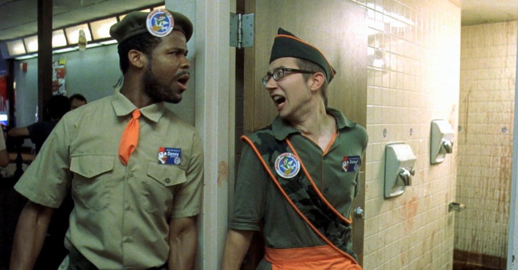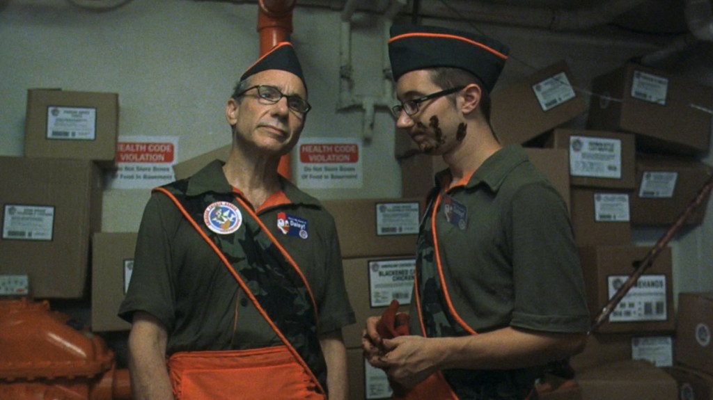 After cleaning up the shit that was Jared, Arbie hopes to find a napkin to clean the shit off his hands. That’s when the American Chicken Bunker chicken mascot arrives to give some sage advice. When he takes off his costume, not only is it Lloyd Kaufman but it’s also someone with a suspiciously familiar story to Arbie’s. I think this is the closest Troma will ever get to The Shining. Old Arbie says he has always worked here. He never intended on being here his whole life. Someday, though, old Arbie will finally have enough money to reunite with his gal Wendy at college. Old Arbie then warns young Arbie to get out as soon as he can and not waste his life as a fast food jerk.