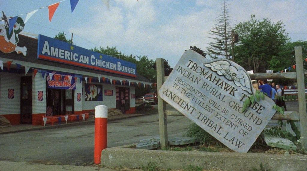 Sometime later, the Tromahawk Tribe Burial Ground was completely excavated. All that remains is the broken down sign. What’s in the graveyard’s place is another American Chicken Bunker, a fast food chain that specializes in lamb chops… Nah, I’m fuckin’ with ya. It’s a chicken shack. Lloyd Kaufman used an abandoned McDonald’s to shoot the movie. If you remember what McDonald’s looked like 20 years ago, you see it right away with the doors.