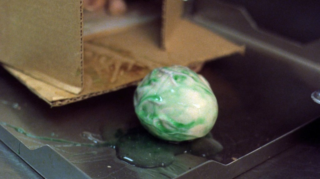 The chicken monster attacks the General. It tries biting him on the face, so he gets the creature back by biting its head off. Its green blood shoots all over the General. He then begins to have convulsions.