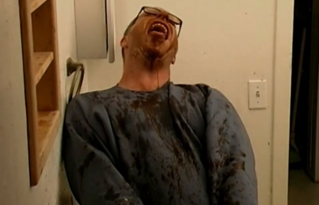Later, a couple argues over the husband’s disgusting bathroom in his man cave. She won’t let him go out to see his friends until he cleans it. As he cleans the toilet (which is covered in shit), things get a little out of hand. That’s when we finally see the Monsturd in all its glory.