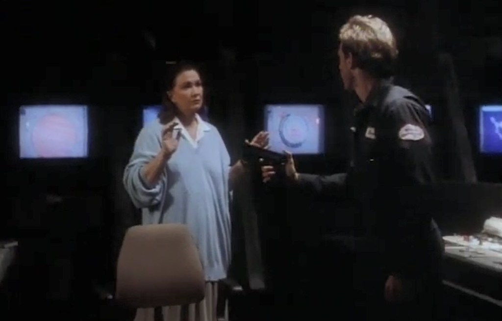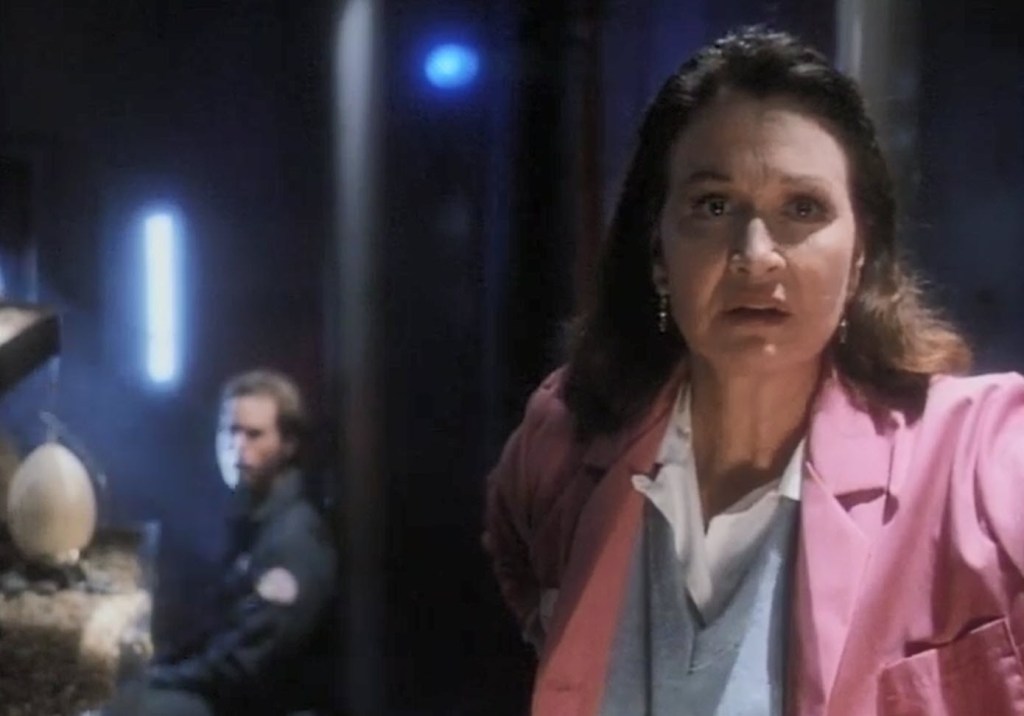 What might surprise many people about this movie is that our lead is Diane Ladd. Yeah, the three-time Academy Award-nominated actress, Diane Ladd, was coming off of two very recent nominations for 1990’s Wild at Heart and 1991’s Rambling Rose to star in a Roger Corman-produced movie about dinosaurs running amok. But that’s not all, my friends. Oh no, she’s not just in this movie and the top-billed person. She’s basically the villain of the movie. She plays Dr. Tiptree. She’s something of a whiz at genetics. She’s basically been off the grid for years. More than that, she’s written into her heavily structured contracts that she remain unbothered, or the company she’s working for, Eunice Corporation, will lose all the patents she’s secured for them.