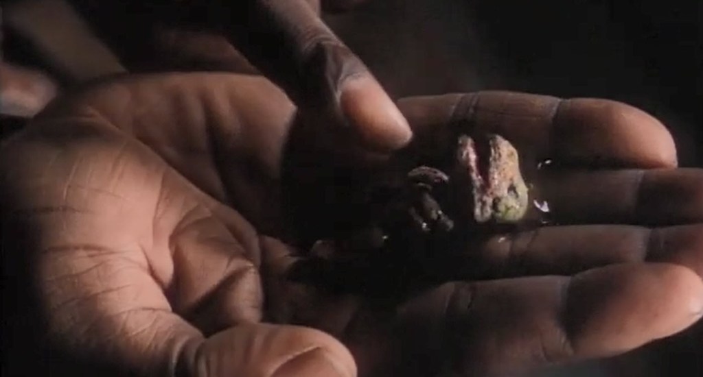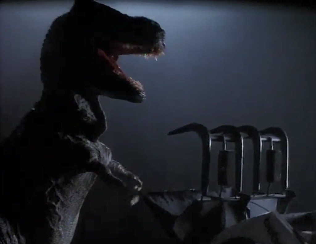 So, for a movie that has been playing this pretty straight up to this point, I love this scene for being kinda silly. First, the Deinonychus just mosies on up to the environmentalists. He’s not coming in with a bunch of roaring or sound. He’s just stepping up to the all-you-can-eat buffet. Second, the leader of the environmentalists actually throws a peace sign and welcomes him as a “green brother” before getting his face eaten off. People are getting their guts ripped, their legs bitten off, and gnawed. It’s great.