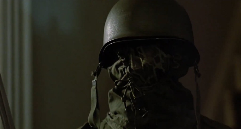 So… Yes, I’m doing this review to give this movie another shot. I hope to like it more than the last time. So, with that, let’s gear the fuck up in our WWII army fatigues and… mask? What kind of mask is that? It’s not a gas mask. Is… is it a medical officer’s mask? Is it keeping his face toasty, or does it serve some other purpose other than making the dude look scary? Eh… Whatever, let’s prowl The Prowler, shall we?