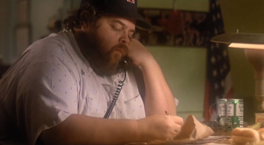 Mark tries to call the lodge where Sheriff George is staying, but the request to get him and come to the phone is ignored and treated without any kind of urgency. The guy at the desk of the lodge’s office doesn’t even check to see if George is in his cabin. So he lies to Mark and just says he ain’t there. This is actually a brilliant element to this movie. More on that in a bit.