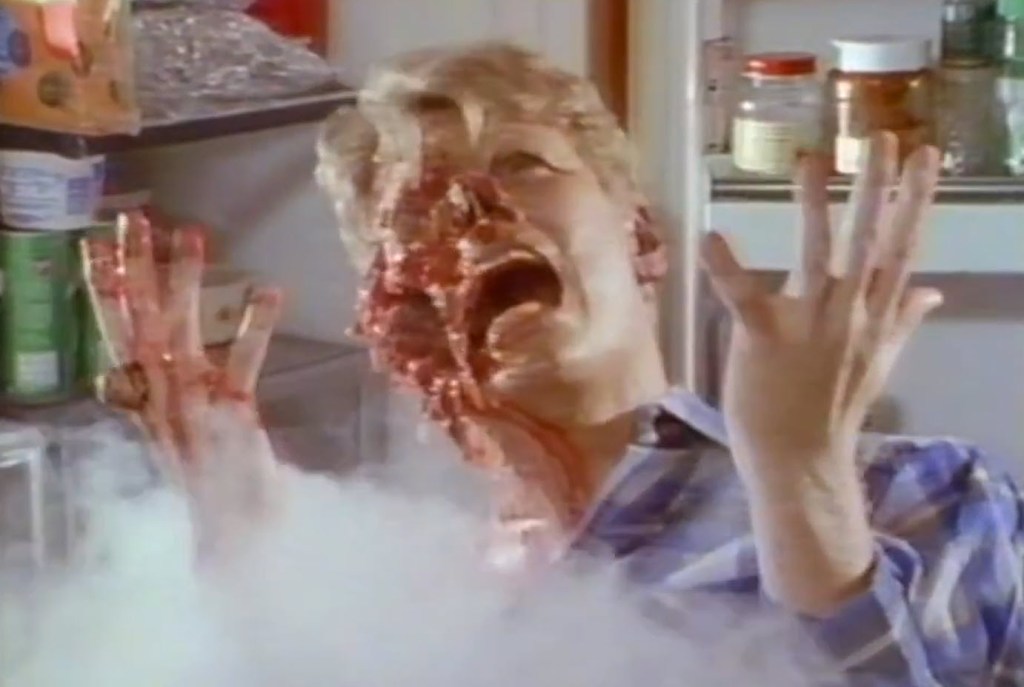 Troy’s idea is much simpler… Just toss it into the dumpster. However, when they get back into their apartment, the book is back on the table. He goes out to his truck with Starla following him. While they are outside, the book opens itself and moves things around, even turning on the television. It also locks them out of the house for a little bit until it just decides to let them back in. Troy tries using acid to dissolve the book, but it creates a toxic cloud that makes Troy barf while everything in the house begins to move on its own. While it blocks the door so Starla can’t get out, it melts Troy’s face.