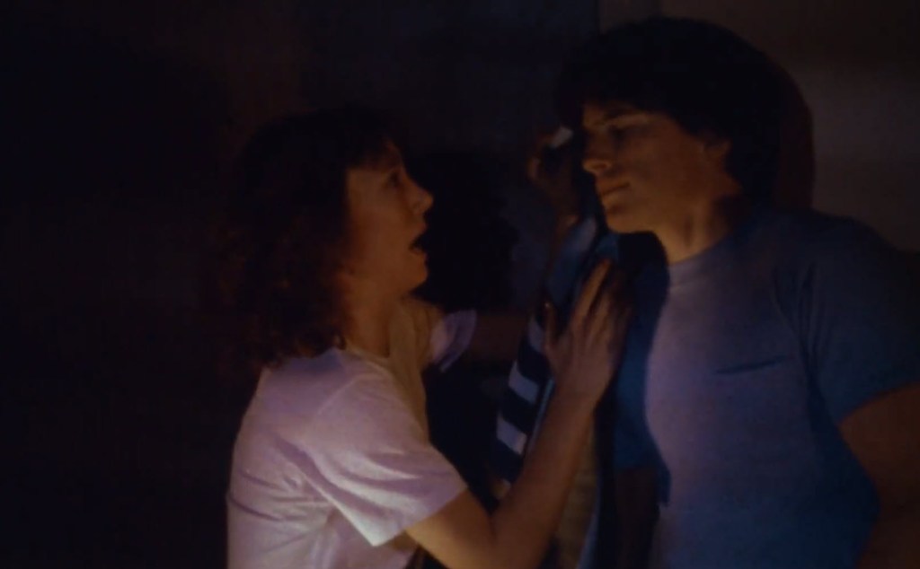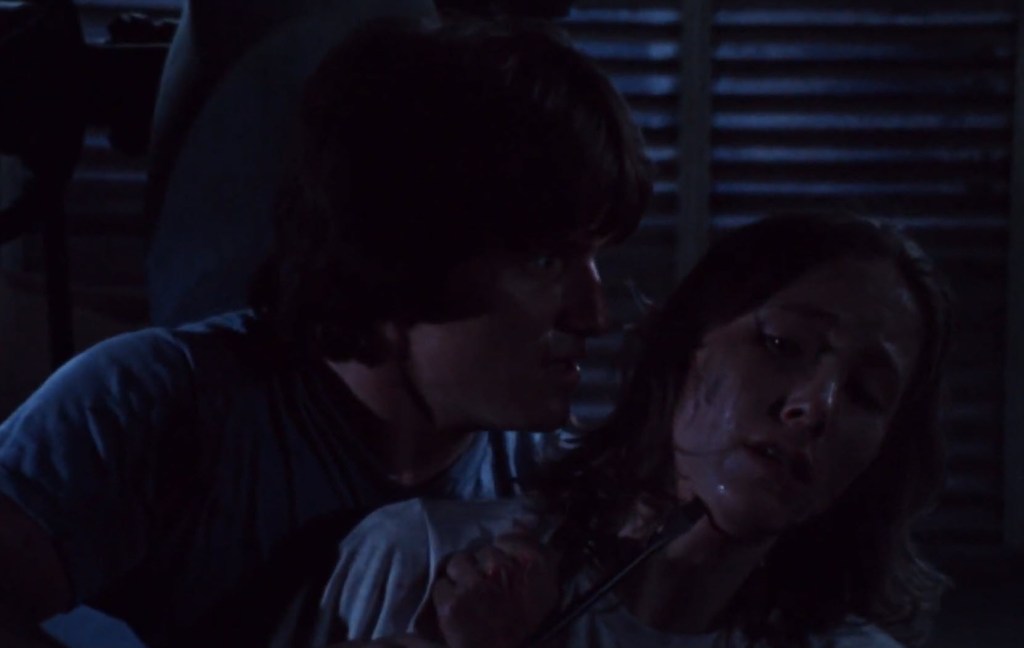 While on the phone with her mom, Joanne hears strange noises that make her think that their prowler is either creeping around outside or on the roof above her. When she tried to call Brian and Craig, neither answered their rooms’ phones. Before Patty can get to Joanne’s room, the prowler cuts the phone line and then cuts the power to the building. Brian comes outside, and Joanne calls to Brian to have him come upstairs to them. As he walks up the stairwell to get to Joanne’s dorm room, he’s confronted by someone with a flashlight shining in his eyes. It’s the prowler, and he slashes at Brian, cutting his arm.