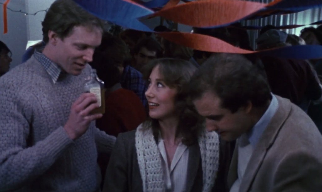 Joanne will be staying behind on campus to help with boarding up the dormitory while Tim and some of his friends are leaving for a ski vacation. The next day, Joanne is joined by friends Brian, Patty, and Craig. Now, Debbie (Daphne Zuniga) was going to be the fifth member of the team, but her parents were already on the way to pick her up to take her home for the break. She is, however, going to help on this first day.