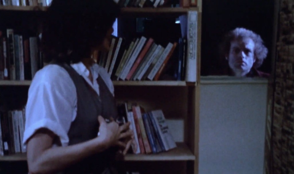 Now, one of her problems might soon be solved. On her way back from trying to find John to talk to him about the trouble he might be causing, she runs into a guy looking to buy some desks from the dorm. He’s going to cut her a check and then send his guys out to pick up the desks. He’s mildly a creeper, but in the 1982 sense. Generally, he’s just a little slimy, not someone to be worried too much about. I mean… don’t worry that he just likes to sometimes prowl around the college and look through people’s garbage for shit to sell – and possibly scope the college chicks. Nothing wrong with that!