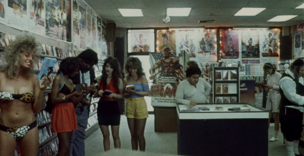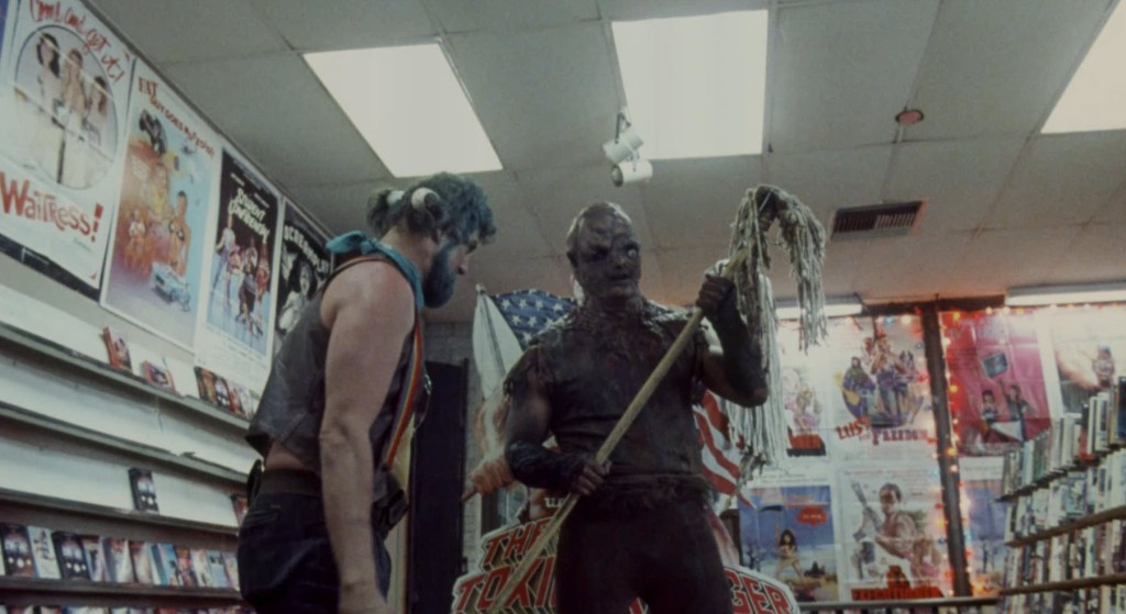 The Tromaville video store is hopping. I love the collection of things in that picture. You have the first thing that sticks out – the woman in the bikini. To the best of my knowledge, there is no beach in or around Tromaville, but whatever. We get some skin in the first few minutes. Then, we have a sort of square chunky guy in a suit talking to three honeys about movies. There’s a standee for The Toxic Avenger. I also think most, if not all, of the posters on the wall and windows are Troma movies too. But if we look to the very far right, I think that might be a Rabbi, or at least a Hasidic Jew, dressed sort of like a Long John Silver’s restaurant employee. Even if I’m proven wrong the moment I click play and resume the movie, I cannot care less. I want that guy to be a Hasidic Jew who works at Long John Silver’s.